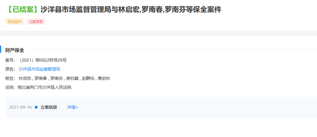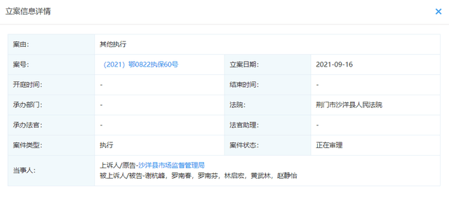 据悉该案件案号为(2021)鄂0822执保60号与(2021)鄂0822财保29号,立案时间为9月16日。据悉案件原告方沙洋县市场监督管理局申请被告方财产保全案,诉至湖北省荆门市沙洋县人民法院,目前该案显示已结案,目前进入到执行阶段。