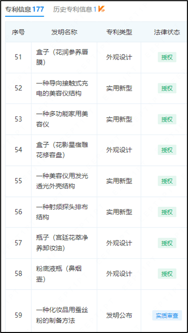 这样说并没有冤枉花西子及吴成龙。公开信息显,花西子申请了177个专利,但是其中超过一半都是滥竽充数的产品外包装设计,即使有一些化妆品产品专利,也是很可疑的中草药、营养物质成分提取技术,从制备工艺上看,很难看出其技术竞争力在哪里。而从这些急匆匆申请的专利上,也可以看到吴成龙渴望摆脱“暴发户”标签,迈入化妆品技术厂商大门的焦灼。但这显然不是一蹴而就的。