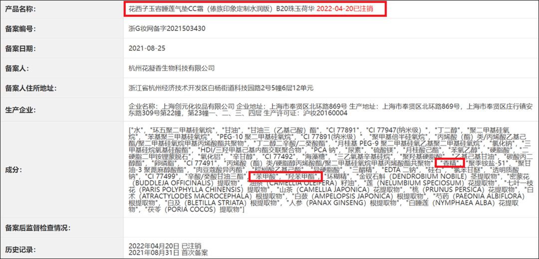 在花西子玉容睡莲气垫CC霜(傣族印象定制水润版)B20珠玉荷华成分表中,不仅添加了香精,更有疑似致癌物苯甲酸和羟苯甲酯,除了这两种高风险防腐剂外,还加入了苯氧乙醇、氯苯甘醚两种防腐剂。一款面霜为何要添加多达4种防腐剂成分?