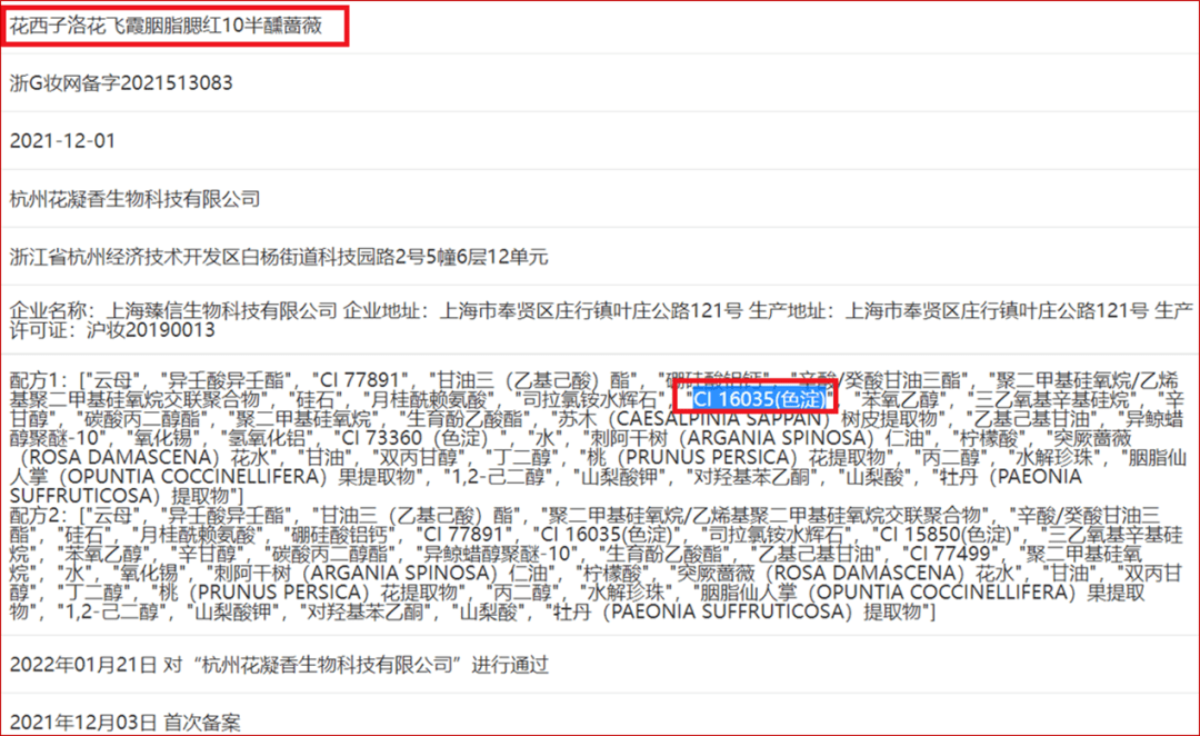 在花西子洛花飞霞胭脂腮红10半醺蔷薇成分表中,有一款叫CI16035的着色剂,该产品是赤色40号,也叫诱惑红,但是,要警惕的是,它属于禁限用物质。这意味着它的风险比较高,对人体不是很安全。