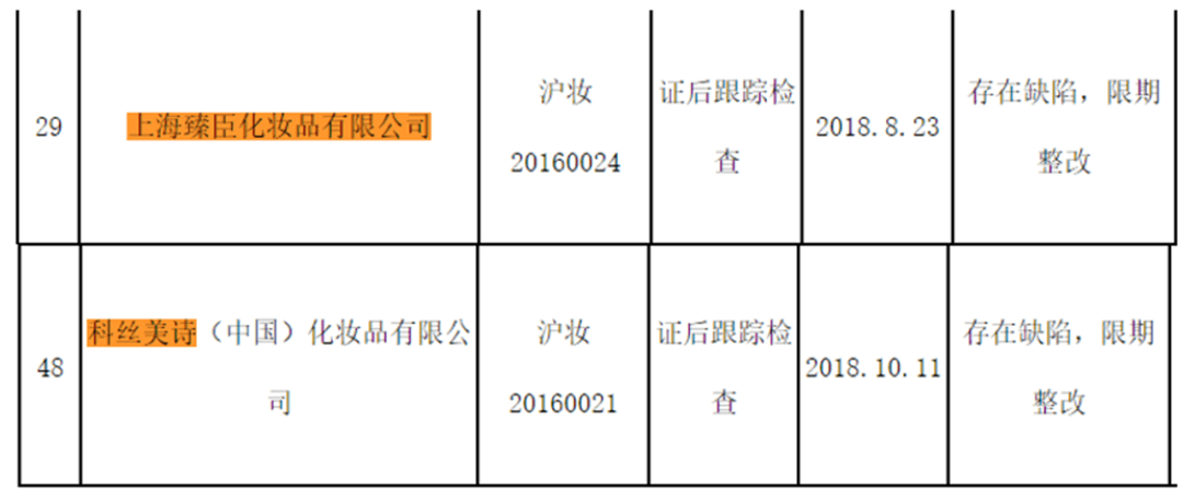 值得注意的是,上海创元化妆品有限公司2018年与2020年两次被奉贤区市场监督管理局要求"采取措施进行整改"。上海臻臣化妆品有限公司、科丝美诗(中国)化妆品有限公司在2018年的化妆品生产企业飞行检查中发现问题,被要求限期整改。