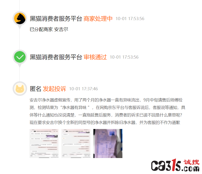 针对安吉尔净水机的质量,引发消费者的不满。3.15诚搜网调查发现,今年10月1日,有消费者通过黑猫投诉平台称,安吉尔虚假宣传,产品不合格,糊弄消费者。这位消费者表示,安吉尔净水器虚假宣传, 用了两个月的净水器一直有异味流出。9月中旬经售后师傅检测,检测结果为“净水器有异味”,在京东平台与客服诉说后,对方说要等通知,具体等什么通知也没说清楚,一直拖延。