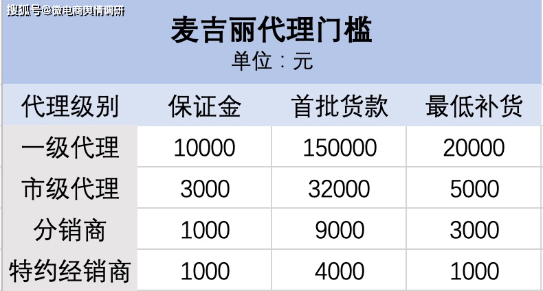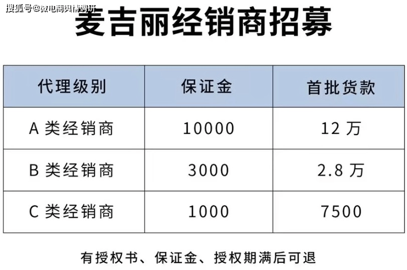 有业内人士表示,因为成本低,麦吉丽一款产品给代理的价格为1000元,给到平台的价格有时则低至百元,这就造成市面上产品卖百来块,代理不断亏本卖,最后都是清空库存就退授权,为扼制代理退出,便有了以低价名义扣代理保证金的情况。