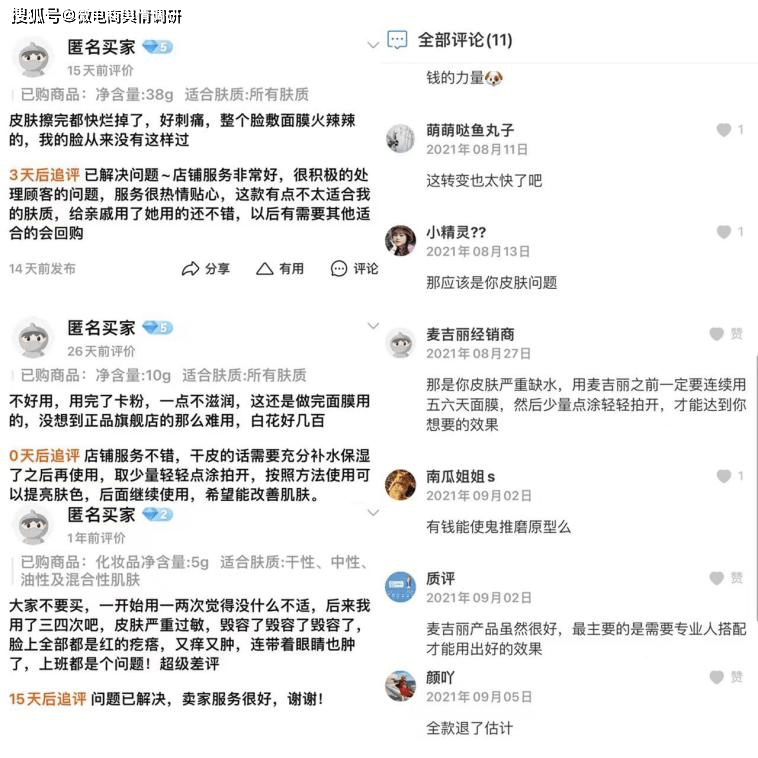 值得一提的是,麦吉丽早期也有过“激素脸”风波,但于各大平台搜其产品却几乎看不到差评,无论是素人推荐、产品测评还是消费者提问,对麦吉丽的夸赞可谓扑面而来,就连旗舰店内的负面评价都自带反转。有部分消费者评论使用后出现过敏现象、产品体验感不佳等评价,但不久后,这些消费者确“神奇”的给出了好评。