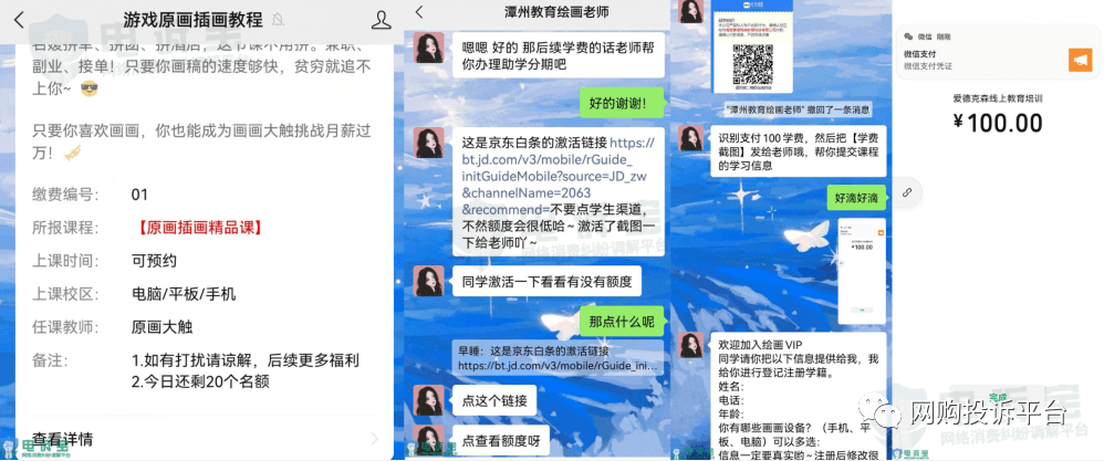 11月1日,浙江省的陈女士向“电诉宝”投诉称自己于2022年8月4日在游戏原画插画教程公众号听一元课后深入了解其课程,加上对方微信后,对方不依不饶诱导消费甚至诱导网贷,幸亏是未成年,京东白条驳回了要求。
