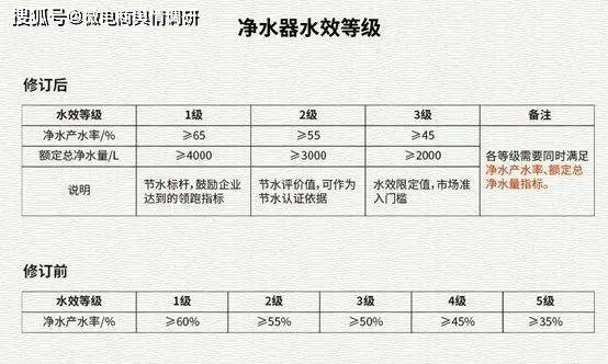 在净水器中,一个重要的指标是水效,即净水产水率,自来水经净水设备过滤后,产生的净水与原水的比值就是该净水器的“净水产水率”,2022年7月1日,新版水效国家标准 GB34914-2021《净水机水效限定值及水效等级》正式实施。新水效国标将旧国标的五个水效等级改为3个等级,最低等级的净水产水率要大于等于45%,相比旧水效国标提高了15%,最高等级的净水产水率要大于等于65%。