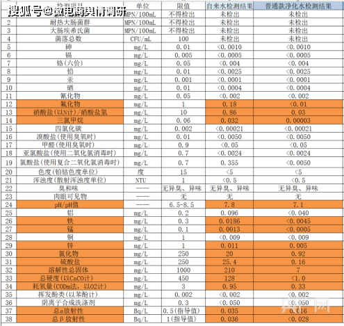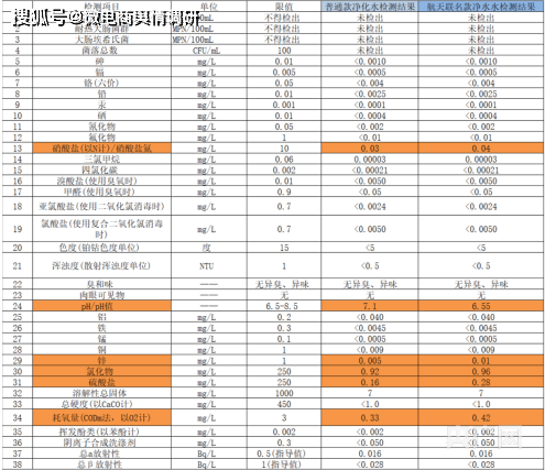 再对比安吉尔普通款净水器和航天联名款净水器的检测结果,可以发现,在38项检测中,只有6个项目数值有变化,其中五个数值是呈现略微上升状态。理论上,净化效果越好,绝大部分检测项目的数值就越小。