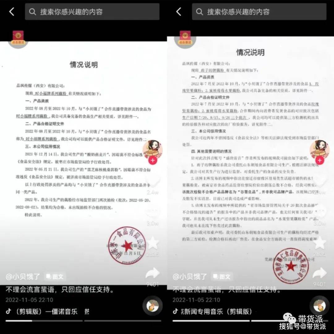 视频的图文是两家藕粉厂家发布的情况说明,第一个厂家表示出问题的其他产品,但是“小贝饿了”带货的产品是合格产品,可提供产品合格证明文件。