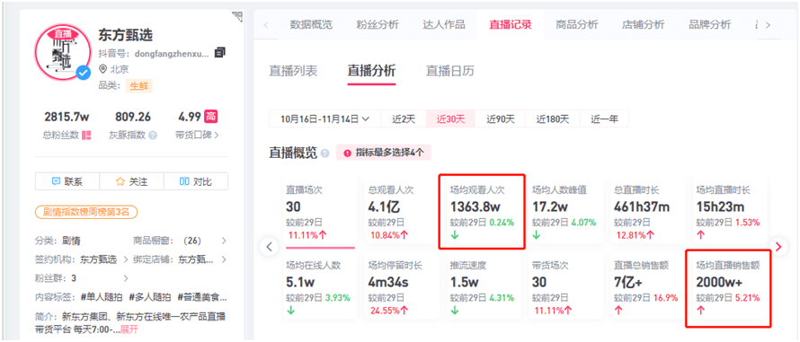 据灰豚数据,小杨哥在11月7日至11月14日一周内直播场均观看人数超4100万,场均销售额超6000万元。而东方甄选在相应时间内场均观看人数不到1400万,场均销售额在2000万以上。小杨哥的热度和吸金能力可见一斑。