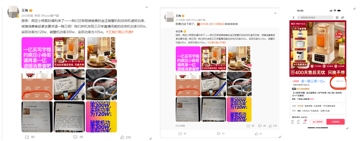 王海在11月12日发布微博称,已举报疯狂小杨哥销售的金正破壁机和绞肉机虚标功率。拆机发现三只羊直播间卖的绞肉机功率300W,实际功率为120W;破壁机功率300W,实际功率为150W。