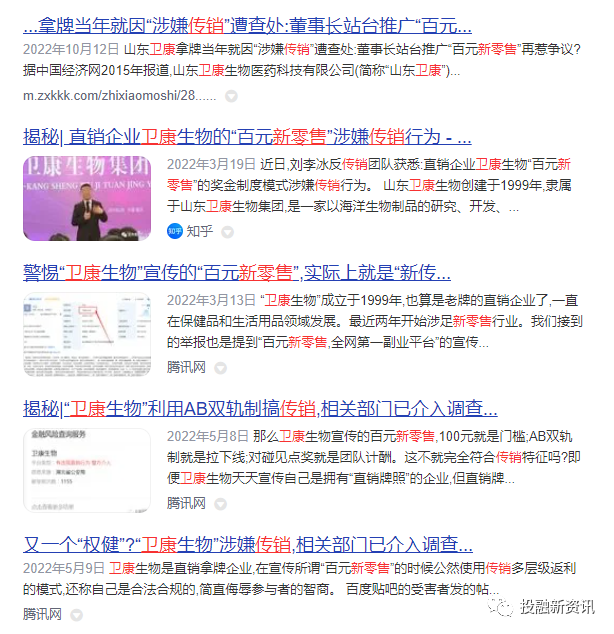 值得一提的是,在今年年初,就曾有媒体曝光卫康生物公司旗下的“百元新零售”平台运营模式也涉嫌传销。