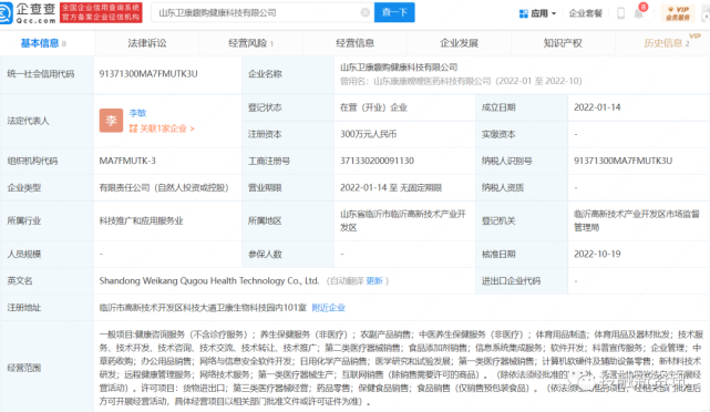 据企查查显示,山东卫康趣购健康科技有限公司成立于2022年1月14日,曾用名为“山东康康嗖嗖医药科技有限公司”,直到2022年10月14日才正式更名为“山东卫康趣购健康科技有限公司”,位于临沂市高新技术开发区科技大道卫康生物科技园内101室,注册资本300万,实缴不详,法人代表李敏任执行董事兼经理。