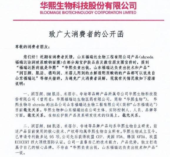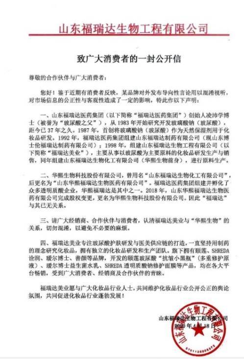 2020年4月17号,华熙生物也发布了一条《致广大消费者的公开函》。相对于福瑞达的不点名,华熙生物则更加直接,公开声讨山东福瑞达生物工程有限公司部分网商借“华熙”宣传,误导消费者。