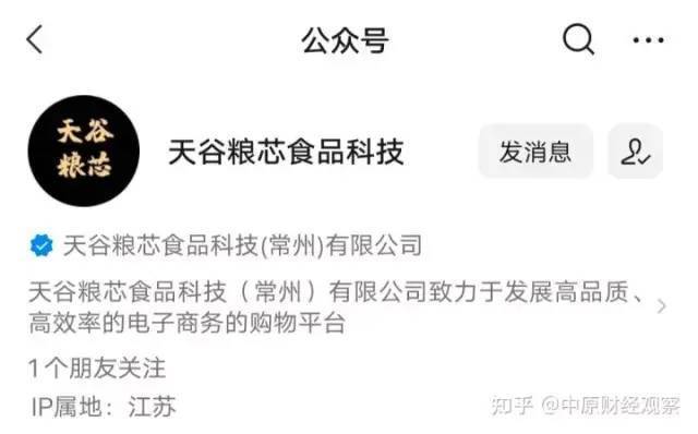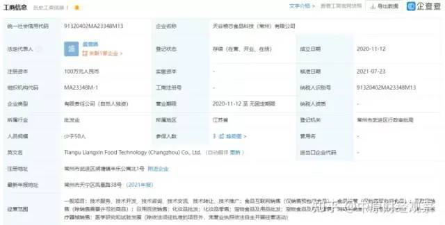 天谷粮芯的认证主体为天谷粮芯食品科技(常州)有限公司。企查查APP显示,天谷粮芯食品科技(常州)有限公司成立于2020年11月12日,注册地位于常州市武进区湖塘镇丰乐公寓北1号,注册资本为100万元,法定代表人为盛雪娟。该公司曾于2021年7月8日进行股东变更,原投资人王云娟、王亚平退出,新增股东盛雪娟,并由盛雪娟100%控股,公司董事也从王云娟变为盛雪娟。