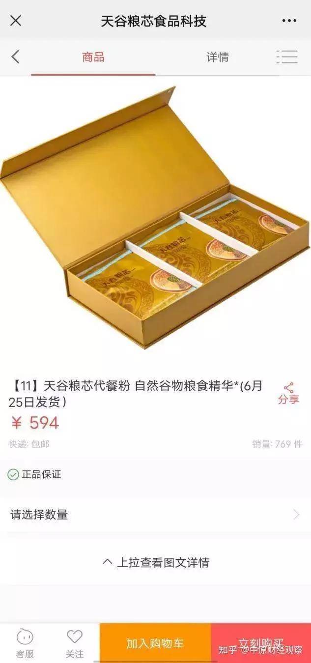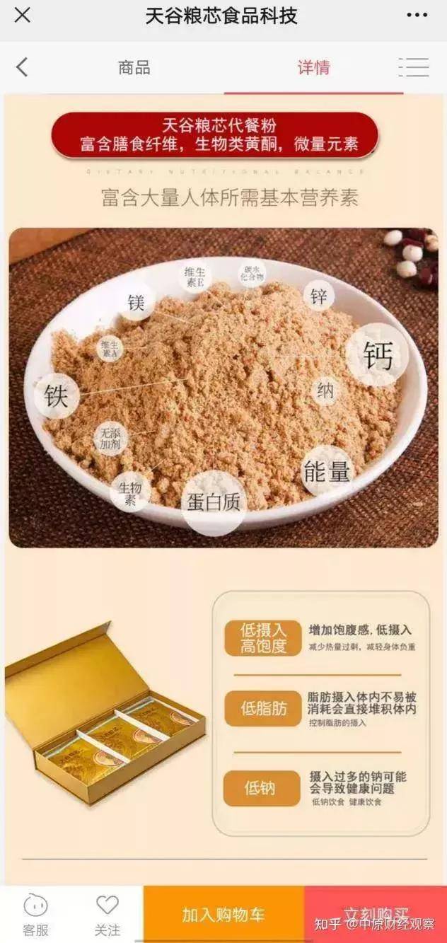 天谷粮芯代餐粉:零售价594元/盒,采用中华传统食补加现代科技改良,提取几十种自然谷物粮食精华,富含膳食纤维、生物类黄酮、微量元素等大量人体所需基本营养素,可以在补充人体营养的同时控制体重,减脂塑形。
