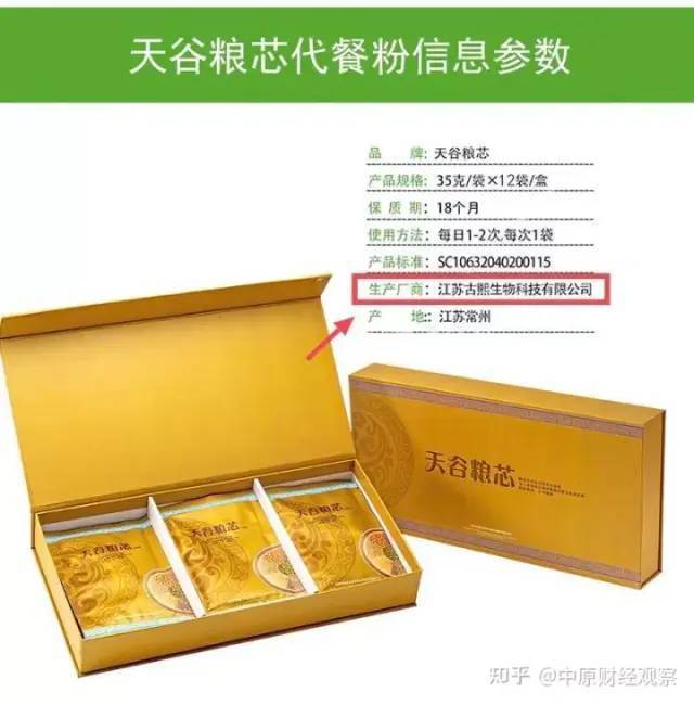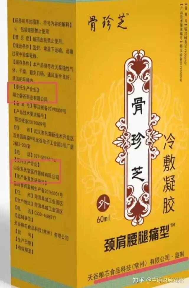 通过产品包装可知,天谷粮芯旗下的代餐粉由江苏古熙生物科技有限公司生产,而骨珍芝医用退热凝胶是由湖北磐谷药业有限公司委托山东朱氏堂医疗器械有限公司生产,天谷粮芯食品科技(常州)有限公司只负责监制。