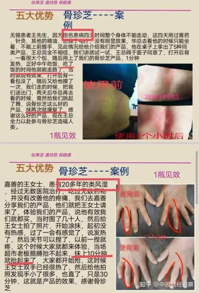 其中,骨珍芝医用退热凝胶是天谷粮芯的主推产品。在代理的宣传中,骨珍芝医用退热凝胶可以治疗头痛、中风、颈椎病、肩周炎、关节炎、风湿、腰间盘突出、脂肪瘤、腱鞘炎、富贵包、静脉曲张、老年痴呆等各种疾病,还分享了许多案例。