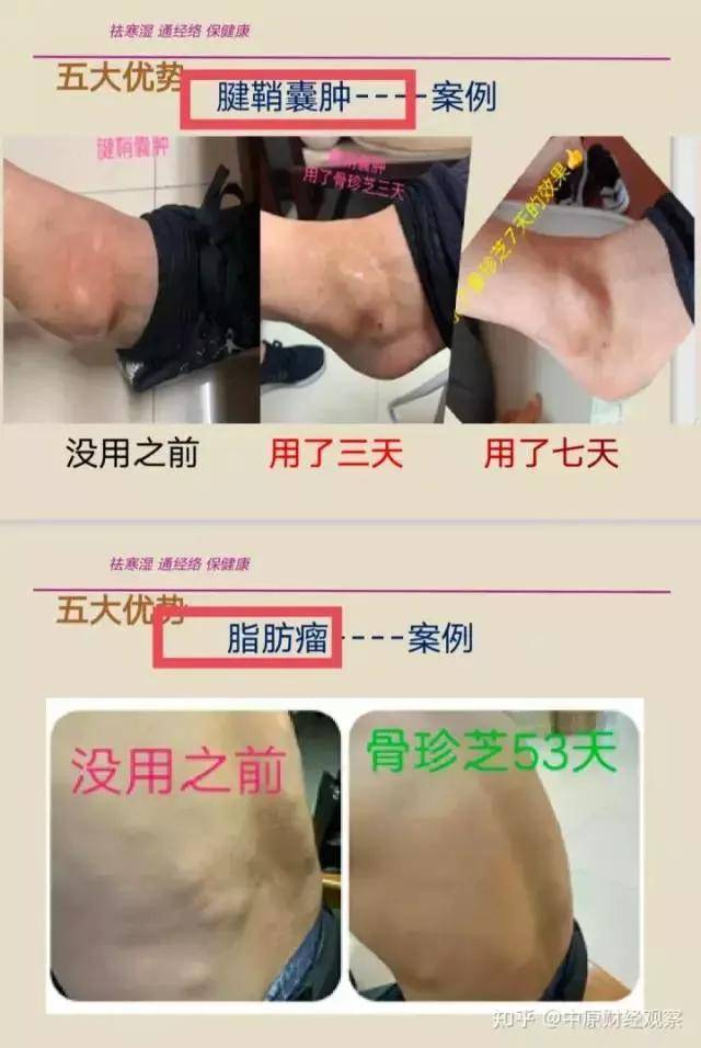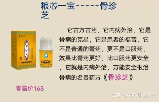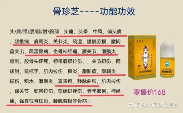 骨珍芝医用退热凝胶:零售价168元/盒,萃取川穹、藏红花、艾叶草、九里香、人参、地龙、丹参、血竭、麝香、鲨甲、乳香、蜂房、鱼腥草、生姜、连翅、狼毒、等等几十种中草药成分,涂抹病变处,能汇集足够的药力,3秒钟透皮,3分钟透骨,骨内发烫迅速疏通瘀阻,解除神经压迫,松解神经根剥离组织粘连,打通筋骨的营养通路,恢复韧带弹性,修复受损的软组织,阻止病变软组织的钙化骨化,使骨错位逐渐恢复,筋入槽恢复弹性,消除,酸,麻,肿,痛,僵,关节屈伸不利等症状。