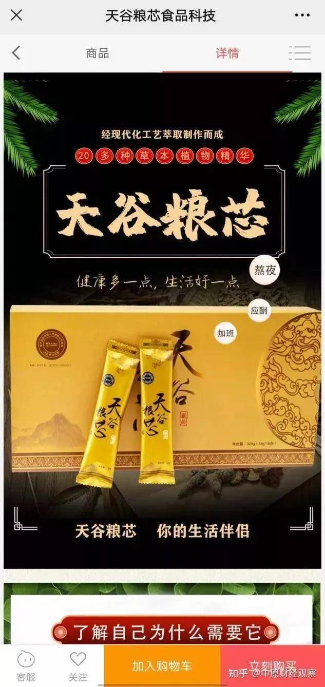 天谷粮芯固体饮料:零售价594元/盒,经现代化工艺萃取20多种草本植物精华制作而成,可以醒酒护肝,清肺润肺,适合经常熬夜、应酬的人群。
