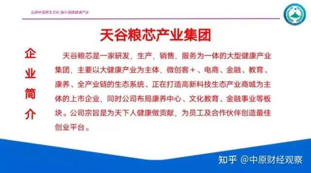 据宣传,天谷粮芯是一家研发,生产,销售,服务为一体的大型健康产业集团,主要以大健康产业为主体,微创客、电商、金融、教育、康养、全产业链的生态系统、正在打造高新科技生态产业商城为主体的上市企业,同时公司布局康养中心、文化教育、金融事业等板块。公司宗旨是为天下人健康做贡献,为员工及合作伙伴创造最佳创业平台。以弘扬中国绿色饮食文化,提高人类健康标准,为社会提供良好的就业和创业机会为使命,要打造百年基业,塑造百年品牌,成就百万精英,服务百万家庭。2022年推出微创客模式,并计划首年业绩达1亿,三年内业绩达到30亿,五年内业绩达到100亿。