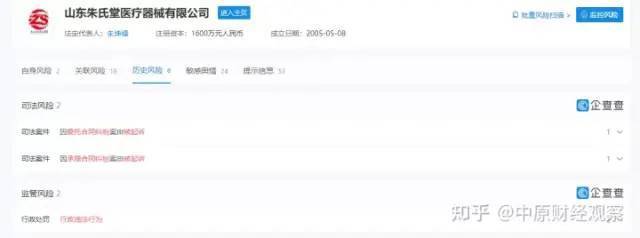 另外,山东朱氏堂医疗器械有限公司也曾因委托合同纠纷案由被起诉1次、因承揽合同纠纷案由被起诉1次、因行政违法行为被行政处罚2次。