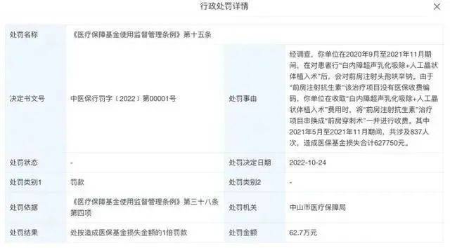据信用中国网站公布的行政处罚信息,经调查,中山爱尔眼科医院有限公司在2020年9月至2021年11月期间,在对患者进行“白内障超声乳化吸除+人工晶状体植入术”后,会对前房注射头孢呋辛钠。由于“前房注射抗生素”该治疗项目没有医保收费编码,该公司在收取“白内障超声乳化吸除+人工晶状体植入术”费用时,将“前房注射抗生素”治疗项目串换成“前房穿刺术”一并进行收费。其中2021年5月至2021年11月期间,共涉及837人次,造成医保基金损失合计627750元。