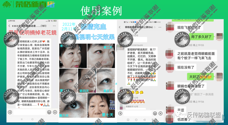 还有代理商发布有用户使用星视明护眼喷雾后摘掉老花镜、眼睛充血七天康复、两天喷好角膜炎、飞蚊症及眼睛干涩在使用该产品后也明显好转的案例。