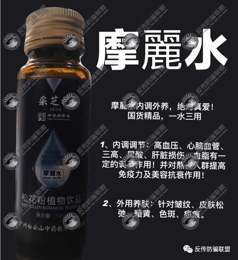 而这款名为“摩麗水”的产品则更是神奇,据产品外包装显示,该产品的全名为“采芝林摩麗水松花粉植物饮品”,据代理商介绍,该产品可内调外养,效果立竿见影,内调对保肝、护肝、三高、心脑血管、尿酸,血糖、便秘、对于胃肠功能紊乱的症状,有明显的调节作用,特别是对于护肝,它能促进肝细胞的活性,使胆汁分泌正常,防止肝病的发生,并能促进肝脏的解毒功能,对于肝细胞有良好的保护作用,包括免疫力下降、它有抗疲劳作用,增强体力。而外用则主要是针对皱纹、皮肤松驰、暗黄、色斑、暗黄、色斑、疤痕等问题皮肤。
