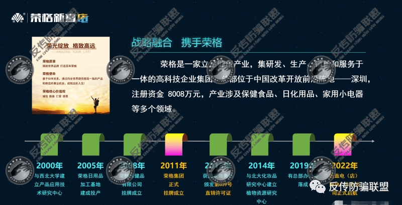 据荣格新直店宣传资料显示,荣格于2013年拿到国家商务部颁发的第039号直销许可证,是一家立足健康产业,集研发、生产、销售和服务于一体的高科技企业集团。总部位于中国改革开放前沿阵地——深圳,注册资金8008万元,产业涉及保健食品、日化用品、家用小电器等多个领域。2022年新直电(店)版块广东分公司正式启航。