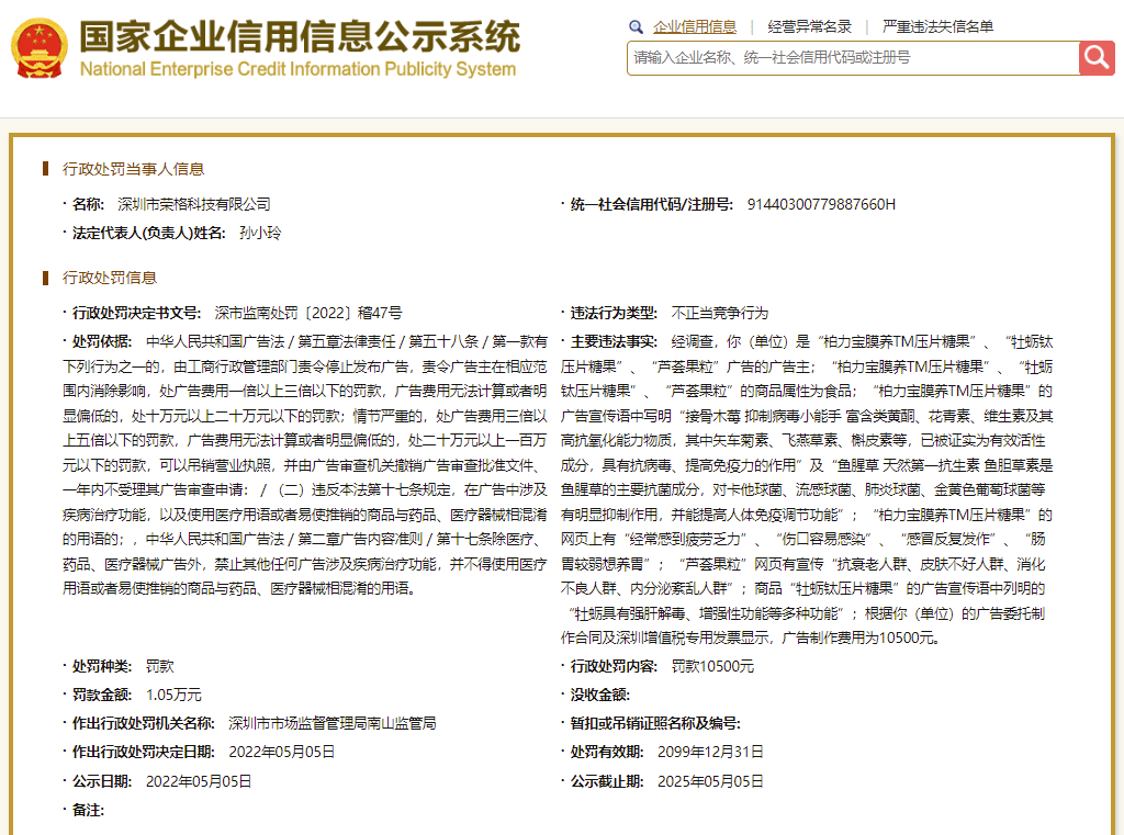 日前,北青网健康在国家企业信用信息公示系统查询到一则行政处罚信息,直销企业深圳市荣格科技有限公司(简称:荣格科技)因虚假广告被深圳市市场监督管理局南山监管局罚款10500元。该行政处罚决定书文号为行政处罚决定书文号,处罚日期为2022年5月5日。