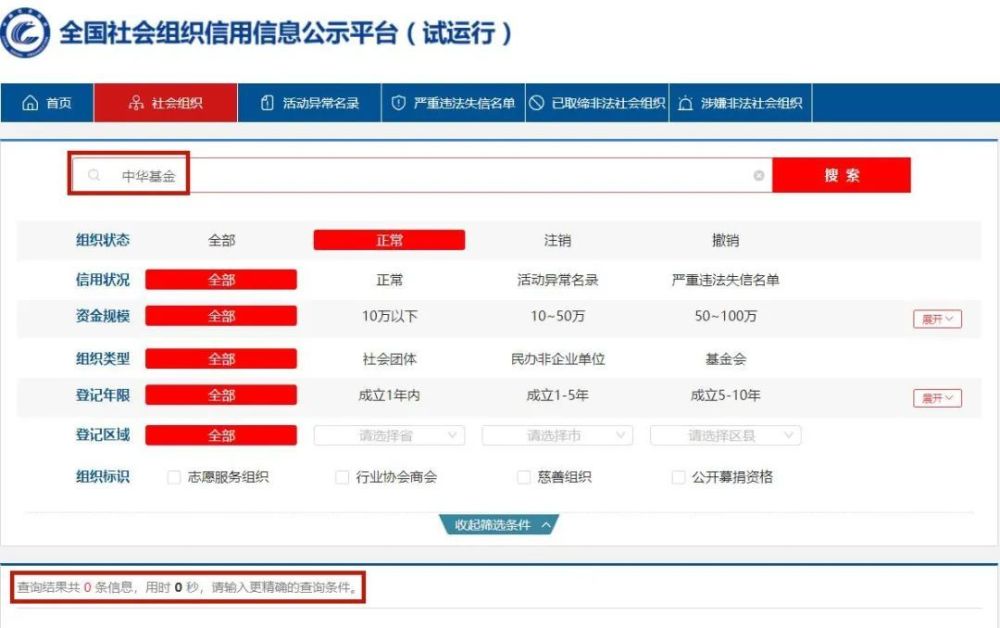 在全国社会组织信用信息公示平台之中查询,没有“中华基金”这个组织。