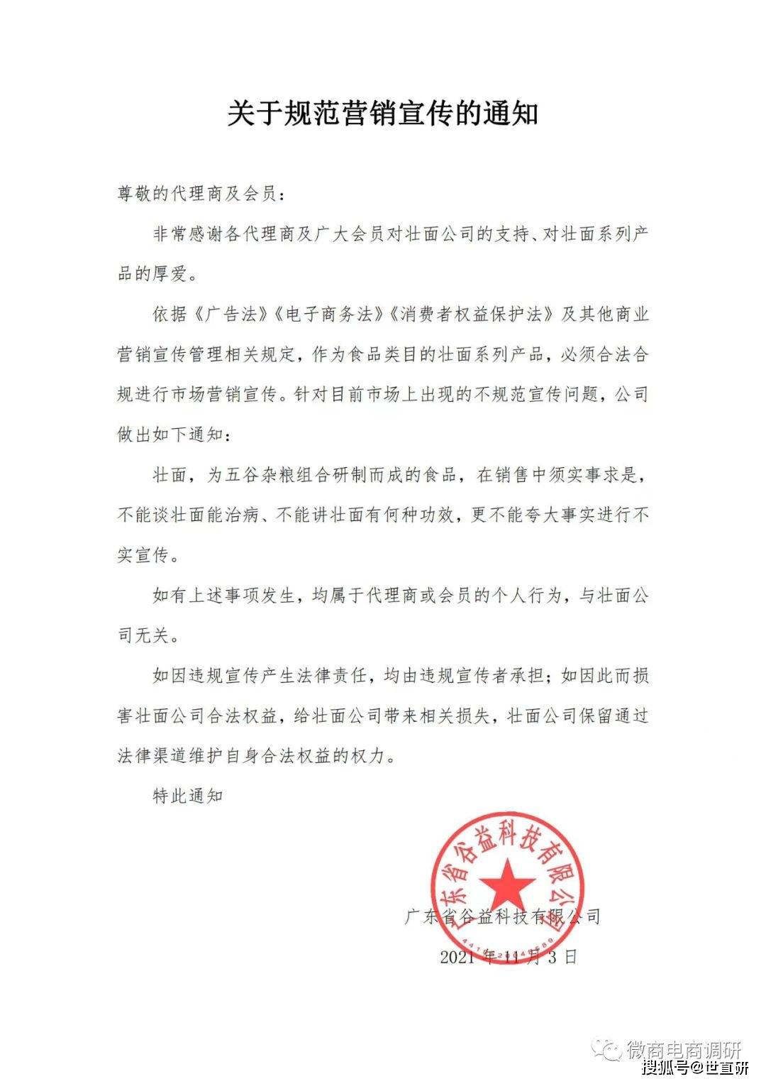 或许是已经认识到代理商们的宣传存在夸大宣传和虚假宣传的嫌疑,广东省谷益科技有限公司在2021年11月3日发布了一份《关于规范营销宣传的通知》。《通知》中提到,壮面,为五谷杂粮组合研制而成的食品,在销售中须实事求是,不能谈壮面能治病、不能讲壮面有何种功效,更不能夸大事实进行不实宣传。