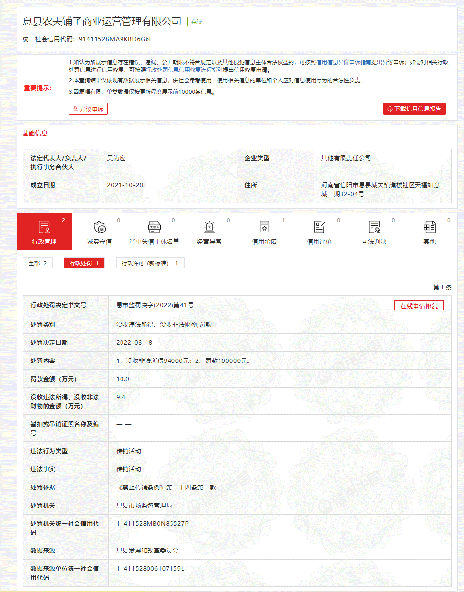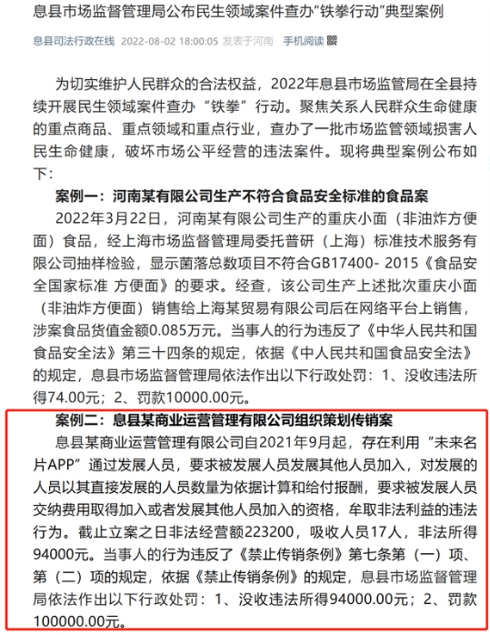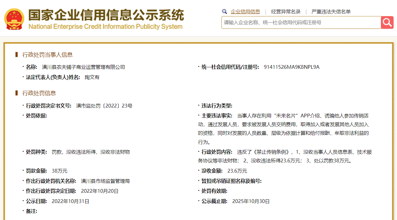 此前,信用中国公布的行政处罚书(息市监罚决字〔2022〕第41号)显示,息县农夫铺子商业运营管理有限公司因利用“未来名片”APP传销被息县市场监督管理局罚没19.4万元,并成为息县司法行政在线微信公众号通报的典型案例。