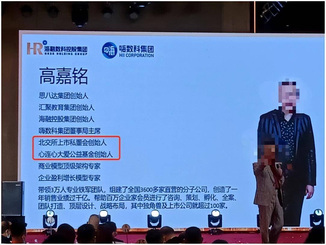 11月23日,记者受推荐人之邀,在湖南长沙华雅国际大酒店参加了湖南嗨数科公司召开的“必唱哥”K歌机产品招商大会,现场主持人隆重推出高嘉铭嗨数科集团和海融控股集团的董事会主席、“北交所上市私募董事会创始人”、“心连心大爱公益基金创始人”高嘉铭先生。