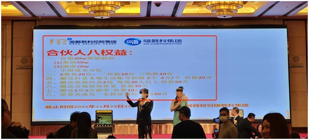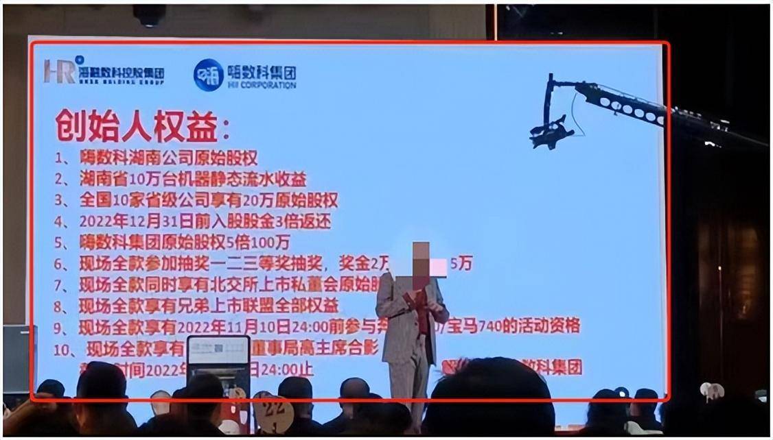 11月中旬,有曝料人向记者提供了视频和文字资料,称湖南嗨数科分公司11月10日在长沙华晨豪生酒店,召开了“创始人股东”招募大会,缴纳20万元成为该公司“创始人股东”即可拥有杭州嗨数科集团100万原始股权,全国10家省级分公司20万原始股权,在12月31日前还能3倍返还。