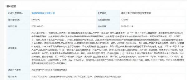 该企业曾因涉嫌生产与标签不符的果味型果冻,在今年3月受到漳州台商投资区市场监督管理局的行政处罚。