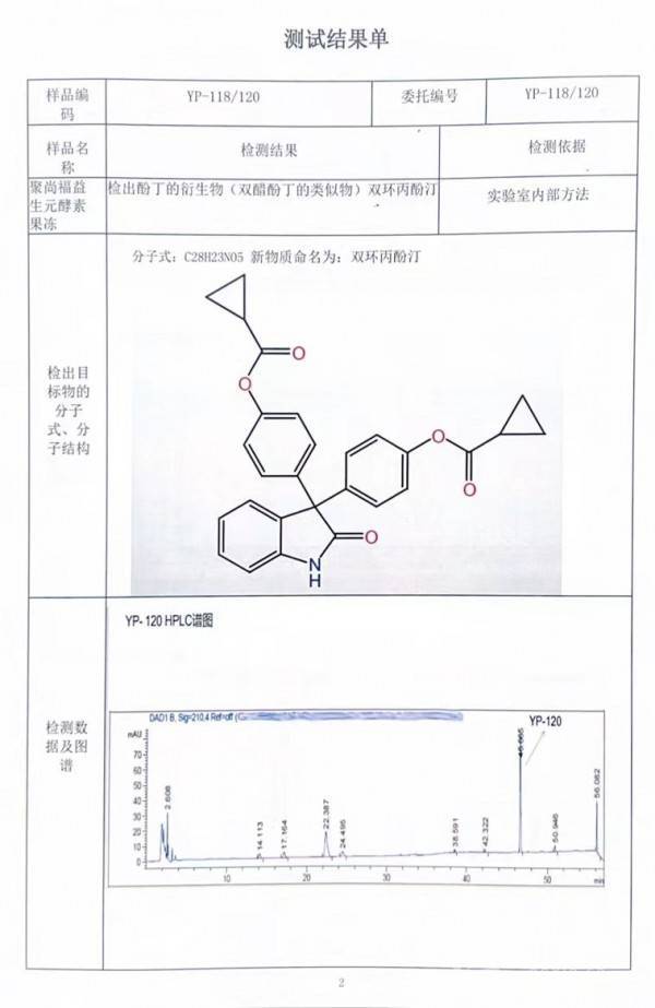 信网12月1日讯(记者 王晨瑜)近日,王海测试科技(北京)有限公司(以下简称“王海测试”)将聚尚福牌益生元酵素果冻交由第三方机构进行了检测,检测结果显示该产品含双环丙酚汀。王海测试认为,这种成分是在“酚汀”的基础上新合成的一种泻药成分,消费者在不知情的情况下食用后有一定的安全隐患,便向国家市场监督管理部门进行了投诉。