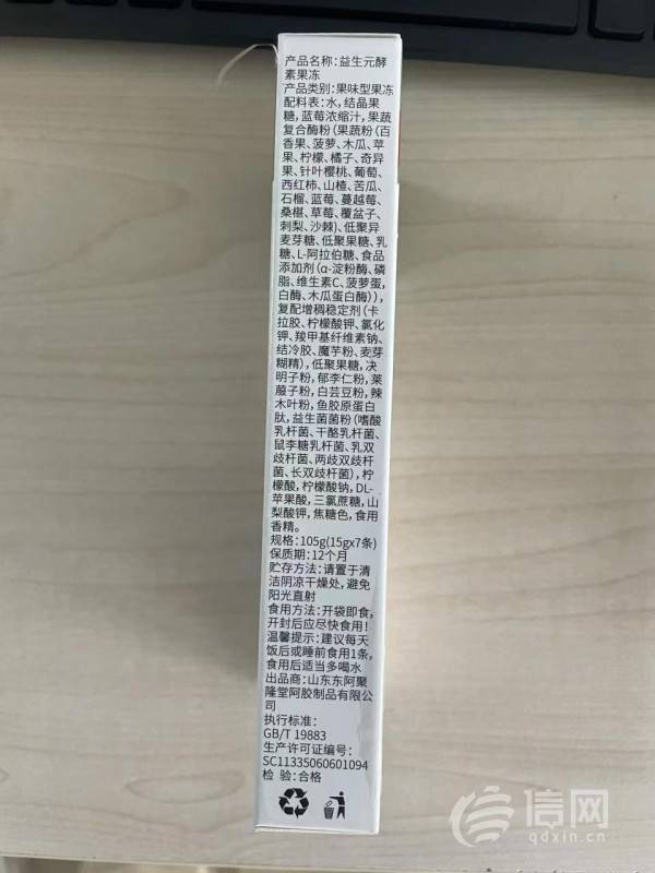 信网从王海测试提供的产品资料中看到,产品的生产商为福建姿美堂实业有限公司,聚尚福牌益生元酵素果冻的配料表里标有果蔬复合酶粉、食品添加剂、复配增稠稳定剂、益生菌菌粉等,并未提及王海测试检测出的双环丙酚汀,产品包装上提示消费者:建议每天饭后或睡前食用一条,食用后适当多喝水。