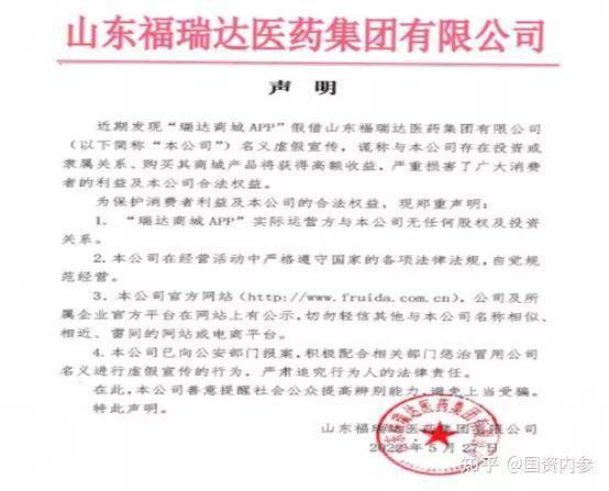 为此,5月27日山东福瑞达集团有限公司在官网刊登声明,称“瑞达商城APP”实际运营方与本公司无任何股权及投资关系。