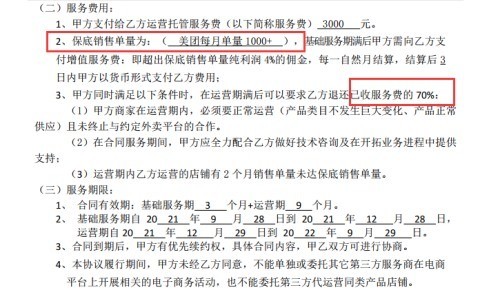 根据唐女士给记者提供的合同可以看到,合同内约定厚德公司为店铺提供产品页面排序、价格核定建议、活动方案制定等服务,并规定店铺在美团每月单量1000以上。合同期限为一年,前三个月是基础服务期,剩余9个月为运营期。运营期内运营店铺有两个月销售单量未达保底单量,则需退还唐女士70%服务费。附加协议表明,在第一个月内厚德公司要保证店铺在15天内达到每日单量20单以上。