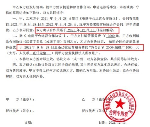 11月30日,华商报-二三里资讯接到山西大同唐女士的投诉,称她在2021年9月28日与陕西厚德天诚商务信息咨询有限公司(简称:厚德公司),签订了一份《电商平台运营合同书》把自己的美团店铺托管给厚德公司运营,但在运营期间效果并没有达到合同内承诺的订单数量,于是与对方解除了合同。目前,距离合同约定的退款时间已过去两个月,唐女士还没有收到2000元退款。