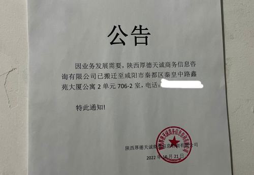 11月30日11点,记者来到了厚德公司的办公地点,却发现对方已搬走,门外张贴了一份公告,公告显示已搬往别处。随后,记者前往告示上的地点,依然没有找到该公司的办公场所,也无法与相关负责人取得联系。