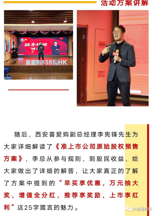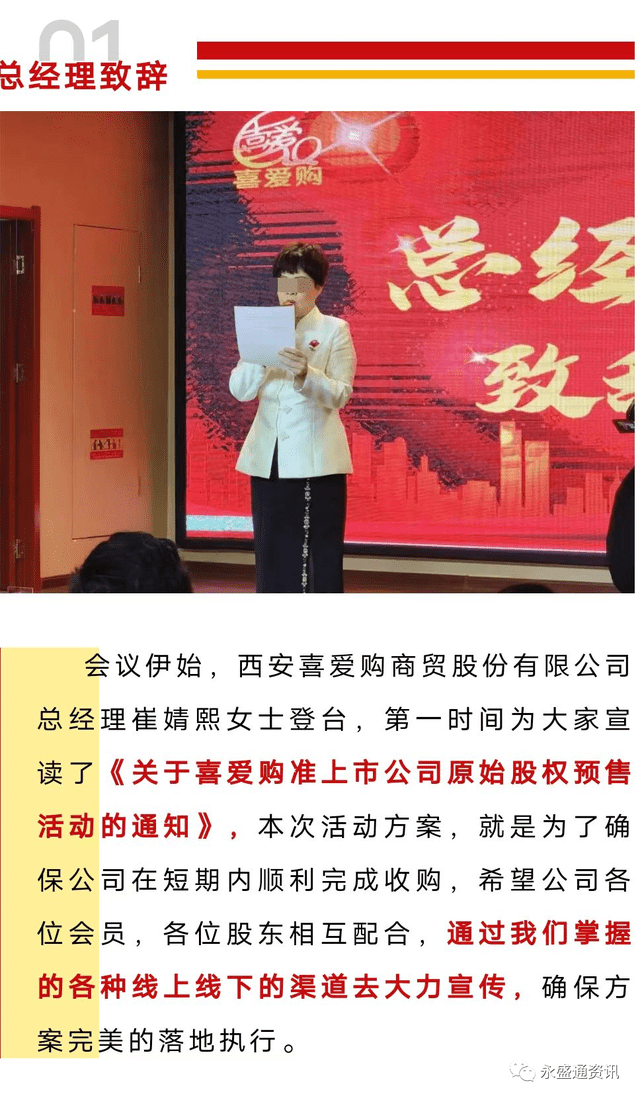 喜爱购总经理崔婧熙、西安喜爱购副总经理李宪锋均在大会公开鼓励通过各种渠道大力宣传此举涉嫌违法行为。