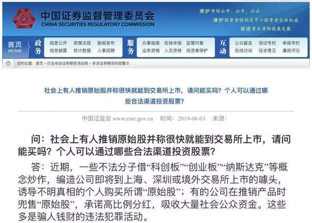证监会发布非法证券期货警示称,近期,一些不法分子借“科创板”“创业板”“纳斯达克”等概念炒作,编造公司即将到上海、深圳或境外交易所上市的噱头,诱导不明真相的个人购买所谓“原始股”;有的公司在推销产品时兜售“原始股”,承诺高比例分红,吸收大量社会公众资金。这些多是骗人钱财的违法犯罪活动。