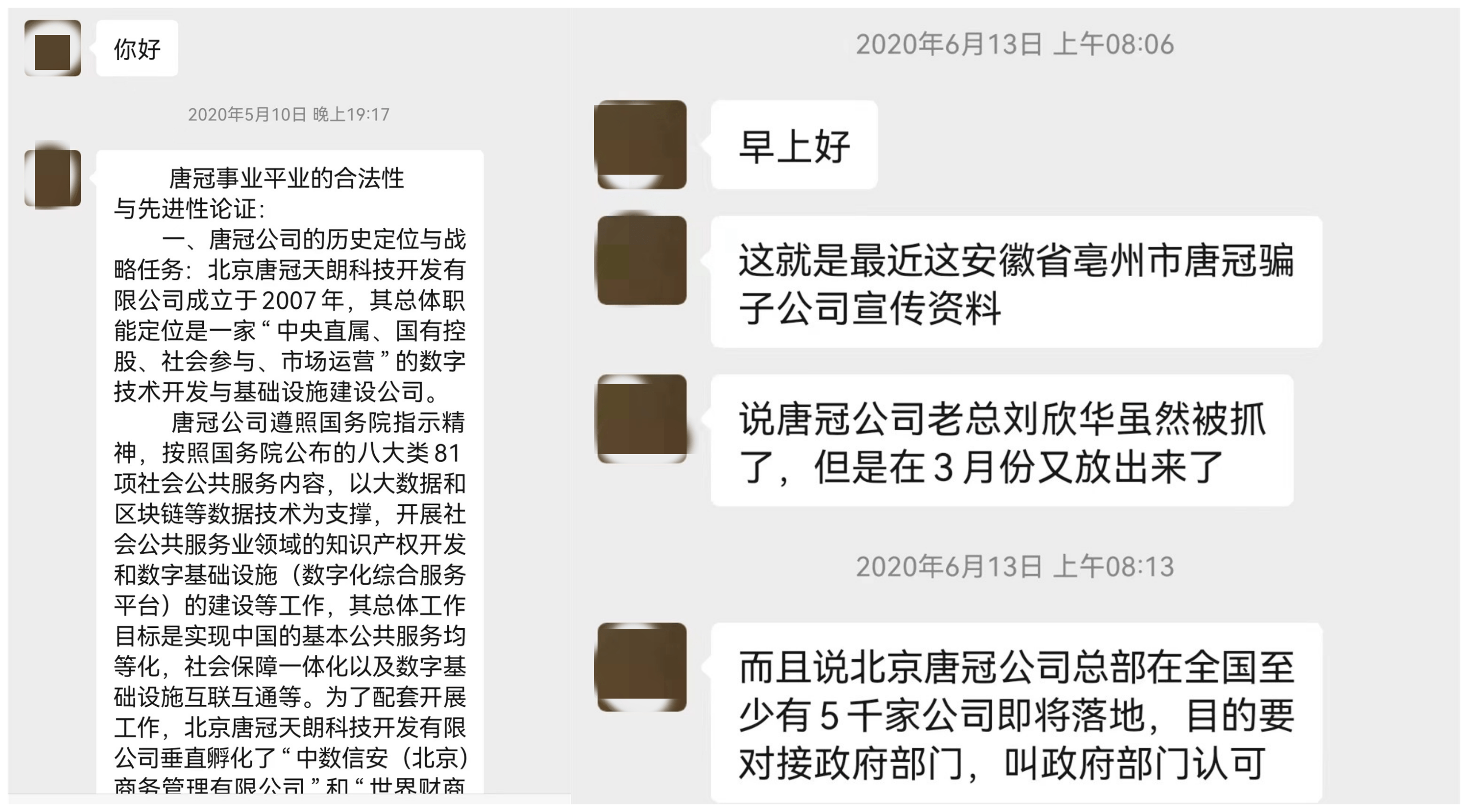 这是2020年5月安徽亳州的一位家属的求助,刘欣华都涉嫌诈骗被抓了,骗子们还在恬不知耻地大谈特谈“唐冠事业平业的合法性”,还编造“唐冠公司老总刘欣华虽然被抓了,但是在3月份又放出来了”的谎言蒙骗投资人。
