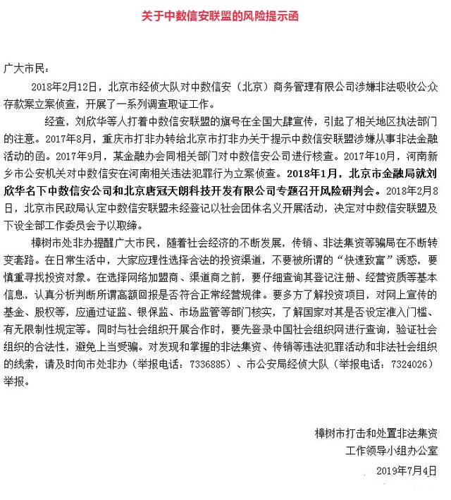 2019年7月4日,江西樟树市打击和处置非法集资工作领导小组办公室发布了《关于中数信安联盟的风险提示函》。该风险提示函表示,2018年2月12日,北京市经侦大队对中数信安(北京)商务管理有限公司涉嫌非法吸收公众存款案立案侦查,开展了一系列调查取证工作。