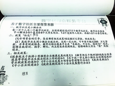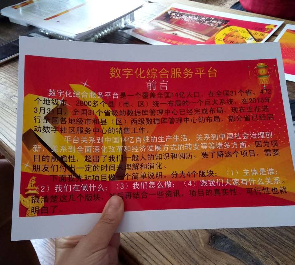 事情是这样,位于山东临沂市一企业以北京数字众智科技有限公司与北京唐冠公司为名,向居民与退休老人宣传关于时政要点“数字政府”、“数字社区”的概念并以“政府下放权力,向企业购买服务,下放近一千二百项政务权力给予数字社区,并需建设几十个唐冠数字社区。”为由鼓动居民老人等向其自愿投资,一万至数十万不等,总共目标三百六十万并宣称收益巨大,数字红利,合规合法。
