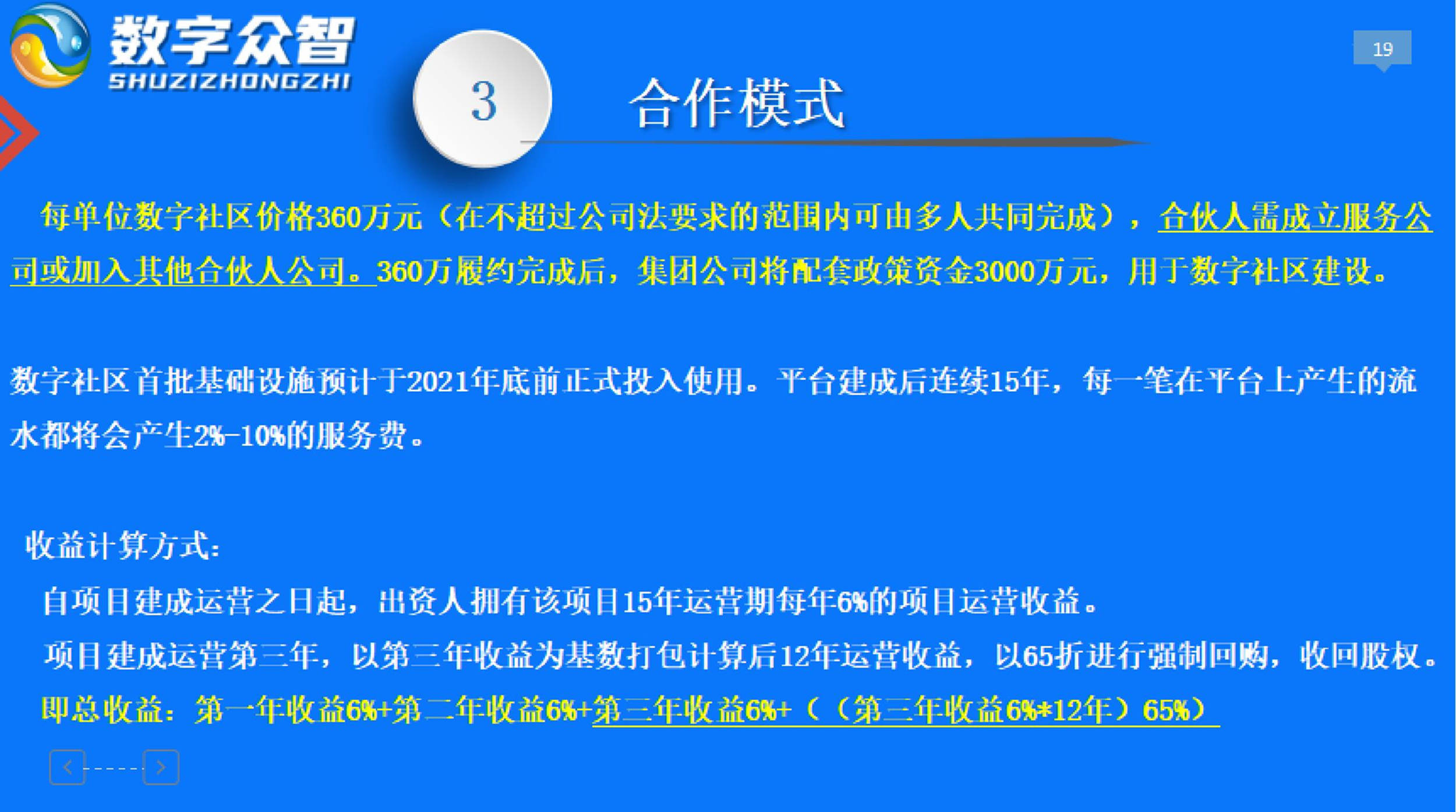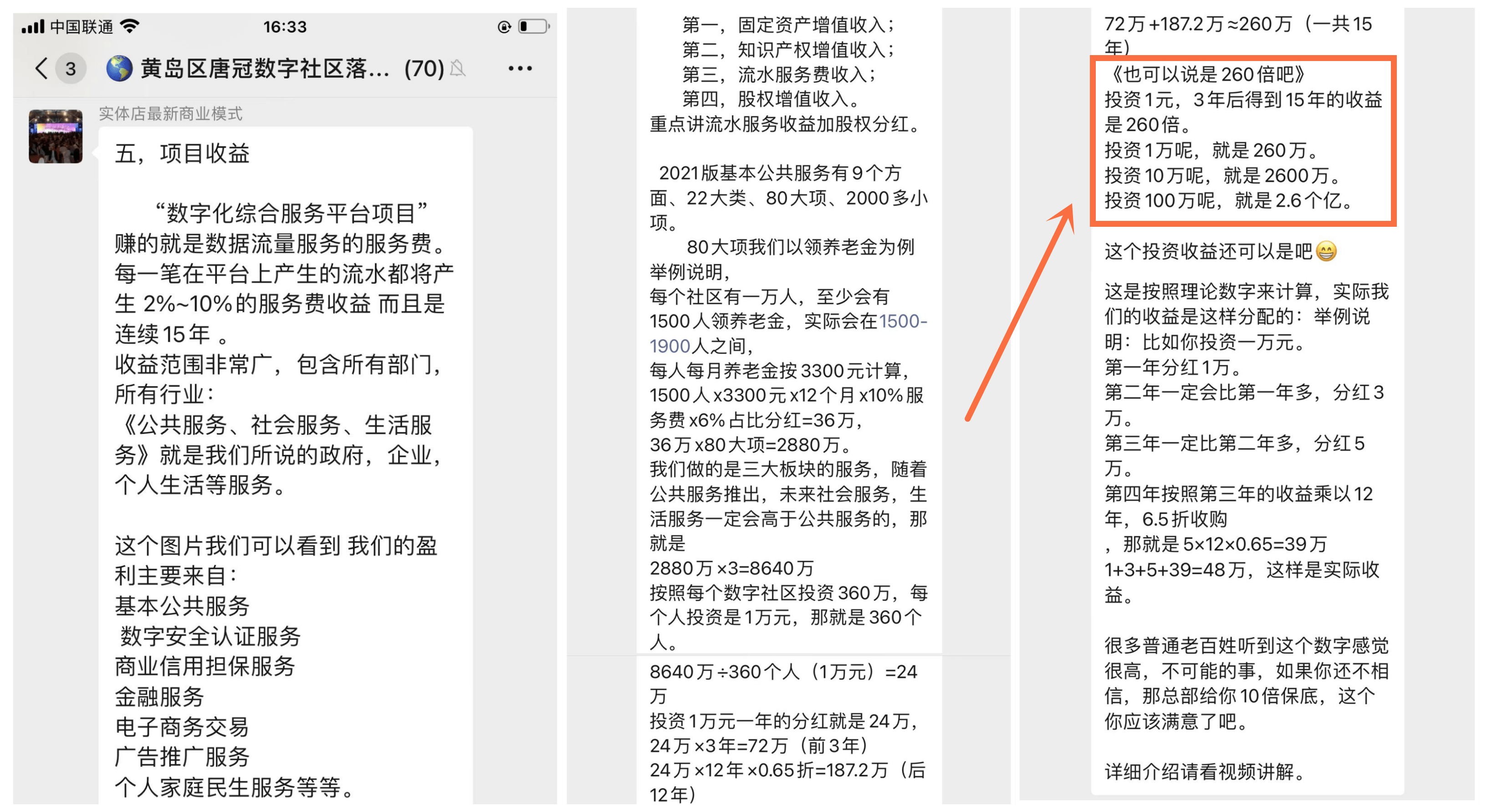 这个号称“前无古人后无来者,千年等一回,可遇不可求的最大商机”,就是由“唐冠数字众智”公司发起的“数字化综合服务平台”,自称是全球首家集成公共服务和生活服务功能的交互式便民服务平台,将以一万人为单位进行基础测算,在全国建立约17万-22万个数字社区综合服务平台。而该项目承诺的收益更是令人咋舌,每个数字社区投资360万,采取合伙人制,约定保底10倍的收益,经营得好的话有可能会达到15倍、20倍以上。