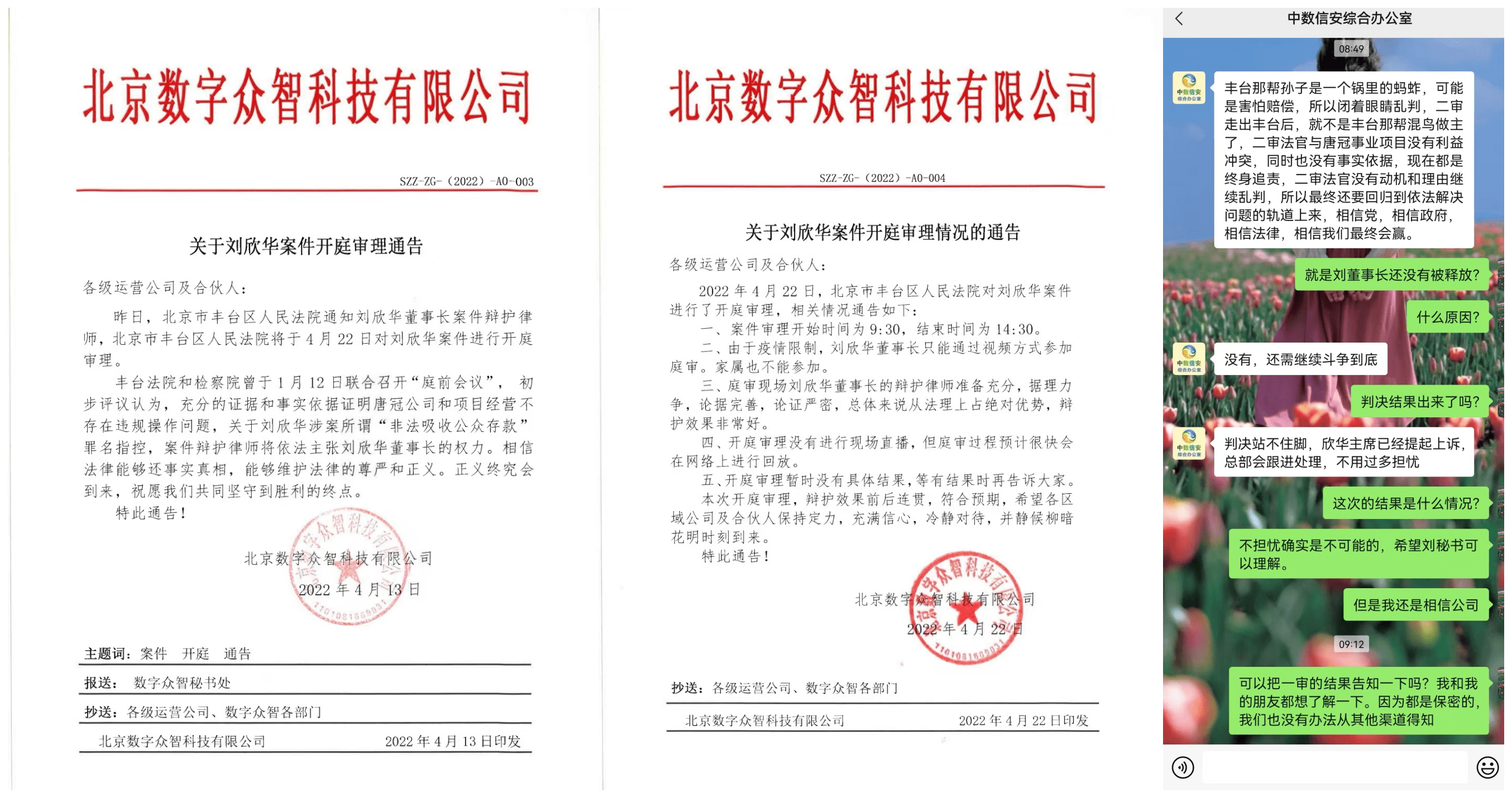 求助者还发来了一些聊天截图,为了内部维稳,骗子们也是煞费苦心,通过公司发的文件也印证了刘欣华非法集资诈骗一案丰台法院已一审宣判,梦想翻案无异于痴人说梦,骗子们以“受害者”自居鸣冤叫屈不说,还极力抹黑曝光他们的人,我本人是他们重点攻击的目标,被扣上了“水军”“黑手”“汉奸”等耸人听闻的帽子,真的是贼喊捉贼,颠倒黑白。