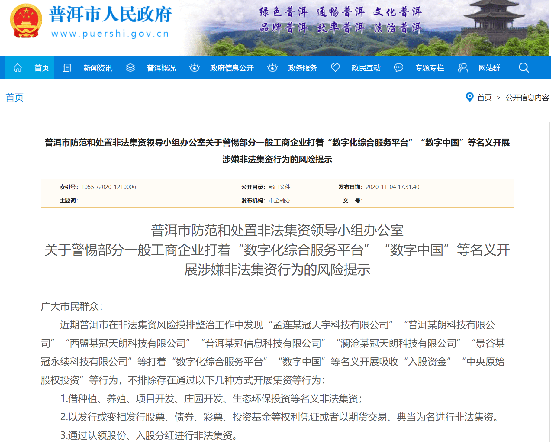 2020年12月18日,云南《普洱日报》发表《对非法集资行为‘零容忍’!普洱严厉整治这类非法集资行为》提到:近期,根据群众举报和市处非办摸排,普洱市处非办牵头公安、市场监管部门对注册名称带“唐冠”的一般工商企业及其他企业打着“数字化综合服务平台”“数字中国”名义售卖“中央原始股”涉嫌开展非法集资行为开展严厉整治活动,约谈涉事企业4家,劝解群众主动退出不再开展非法集资行为。下一步,对非法集资行为普洱市还将继续摸排,严厉打击。